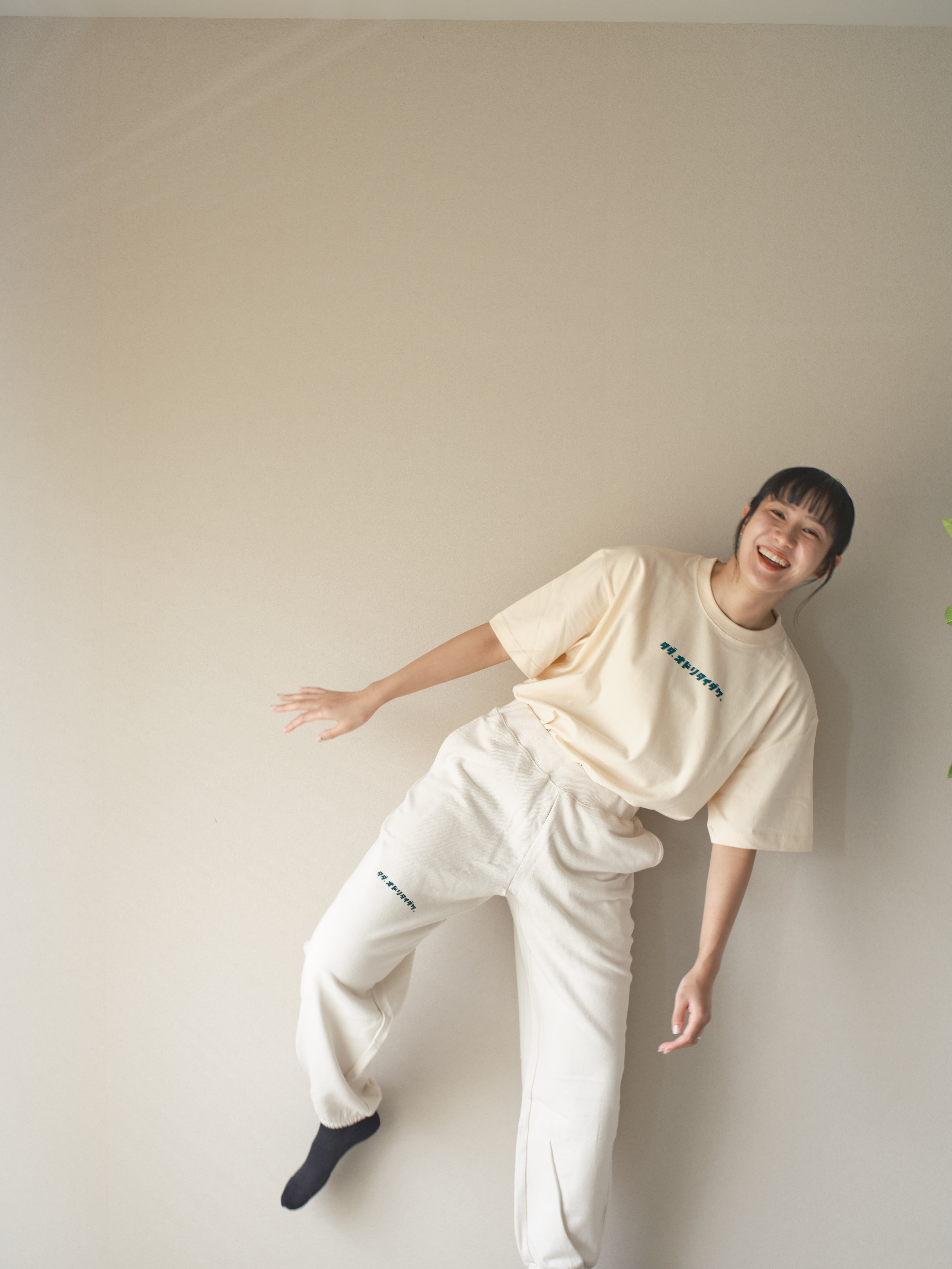 淡いクリームカラーに、胸元のロゴがさりげなく映えるTシャツ。